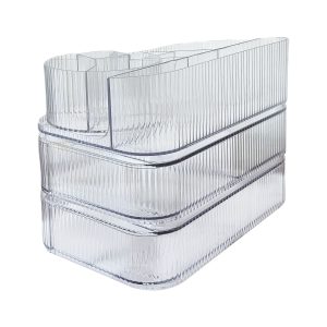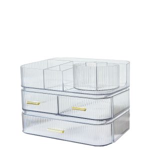 Notre boîte à cosmétiques, comme illustré, est faite de matériaux transparents haut de gamme avec une texture nervurée délicate. La conception Multi – compartiments, mais aussi la conception avec des tiroirs, offre beaucoup d’espace pour tous vos produits cosmétiques.